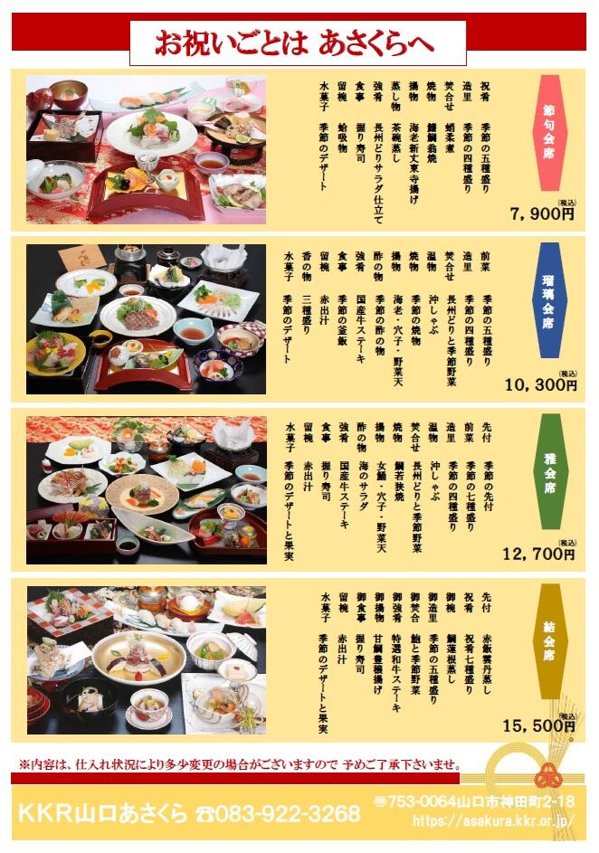 | 料金 | 会席料理 6,600円(税込)よりご用意しております。 ご予算に応じてご提案致しますので、お気軽にお問合せください。 |