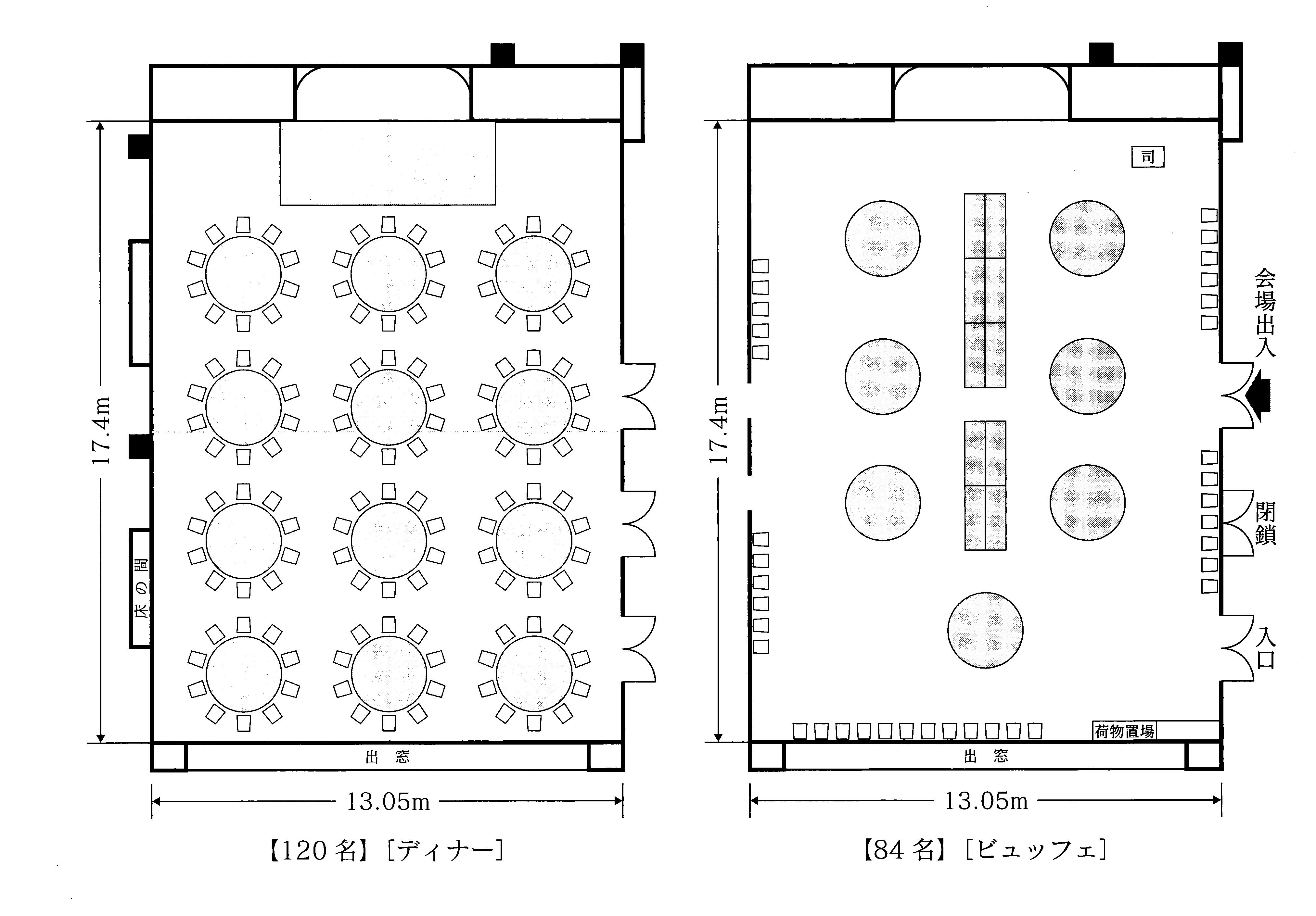 自然光を取入れた明るく爽やかな印象の【扇の間】。LEDを使用した曲面壁でバリエーション豊かな雰囲気を演出する【翠の間】。【扇翠の間】として最大120名の会合でのご利用も可能です。